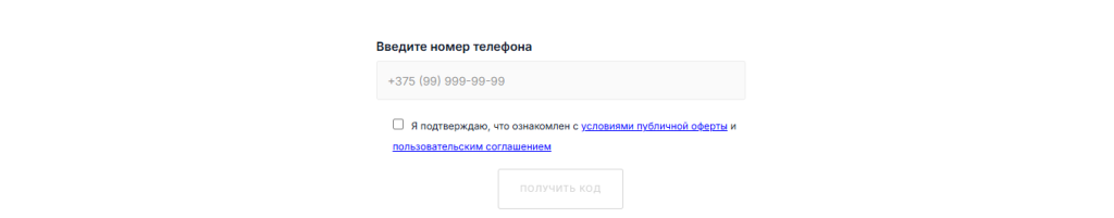Далее Вам будет необходимо ввести свой номер телефона для получения SMS-сообщения с кодом и подтвердить свое согласие с условиями Публичной оферты и Пользовательским соглашением, чтобы пройти регистрацию на сайте.