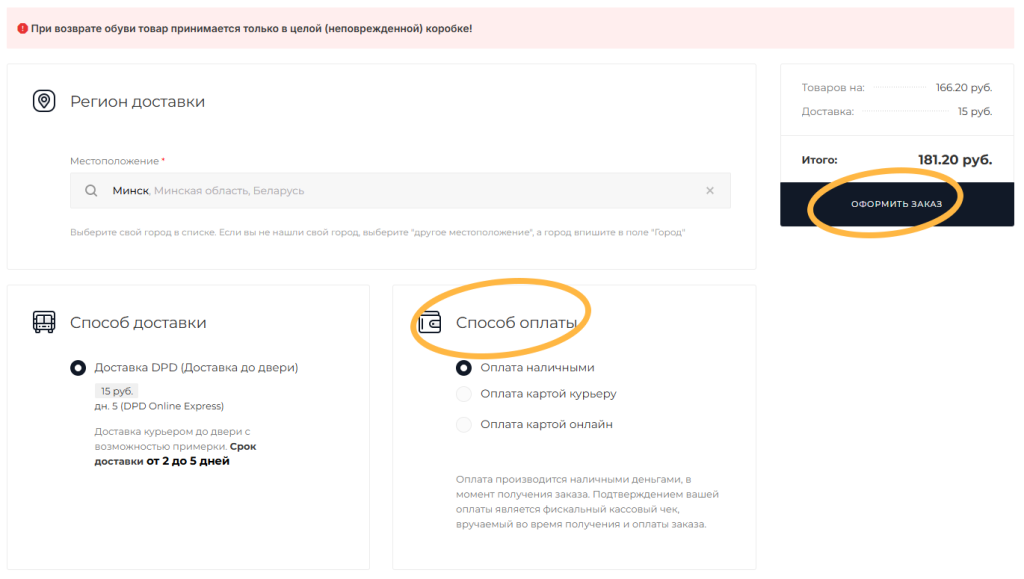 Оплата заказа может осуществляться по факту с возможностью примерки обуви. Принимается оплата банковской картой или наличными.