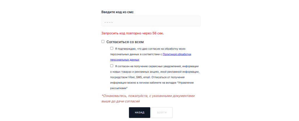 Далее Вам будет необходимо ввести полученный код из SMS-сообщения в соответствующее поле и подтвердить свое согласие с Политикой обработки персональных данных и получения сервисных уведомлений, информации о новых товарах и рекламных акциях, иной рекламной информации, посредством Viber, SMS, email.