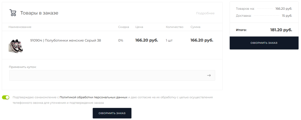 Далее вам необходимо ввести следующие данные: Ф.И.О., E-Mail, Телефон (если контактный номер телефона получателя заказа отличается от введенного при регистрации на сайте), Адрес доставки и подтвердить согласие с Политикой обработки персональных данных.